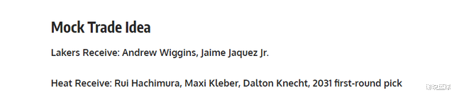 如今2026年已经到来,媒体FW也脑洞大开,支招湖人跟热火交易。方案里紫金军团可以追两锋线悍将安德鲁-维金斯和小海梅-哈克斯,而湖人送出三球员,包括八村塁、克勒贝尔和克内克特,再加上一个来自2031年的首轮签。